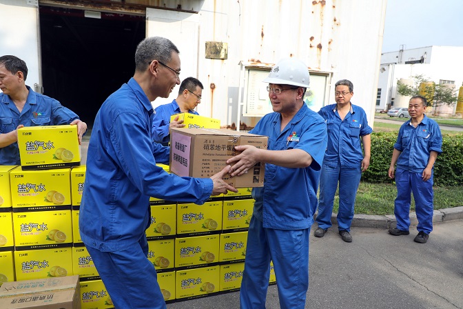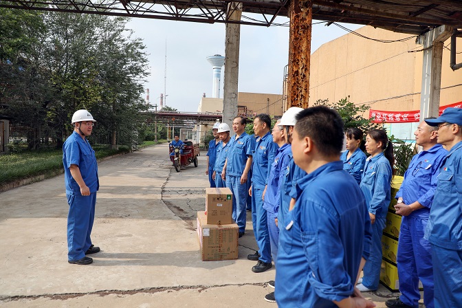 公司黨委副書記、總經(jīng)理陳志剛帶隊(duì),先后來(lái)到動(dòng)力廠、裝備制造廠、CNG加氣站、光熱科技、光伏新材料和安彩能源,為一線職工送去飲料、菊花茶、風(fēng)油精、藿香正氣水、仁丹等防暑降溫藥品和物資,確保生產(chǎn)安全,職工平安度夏。
